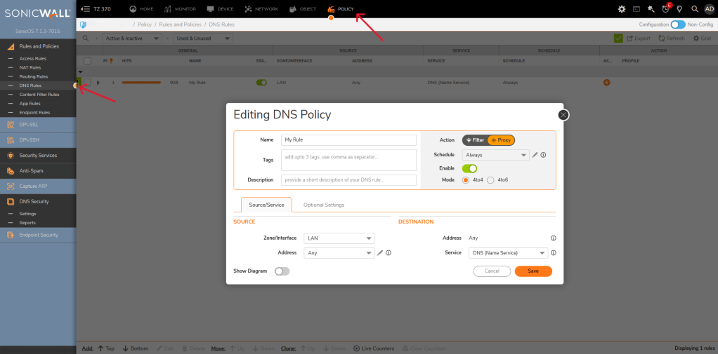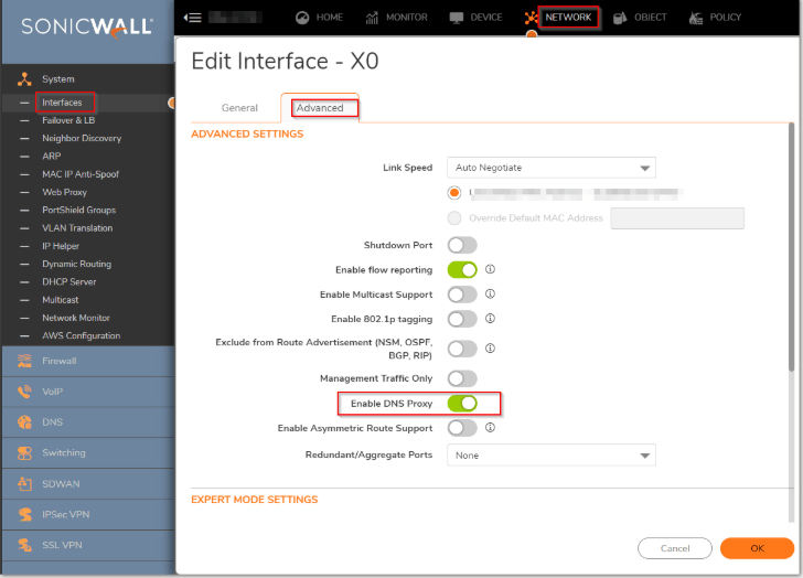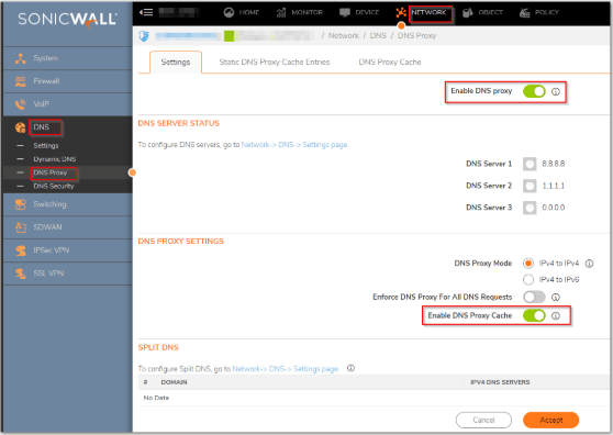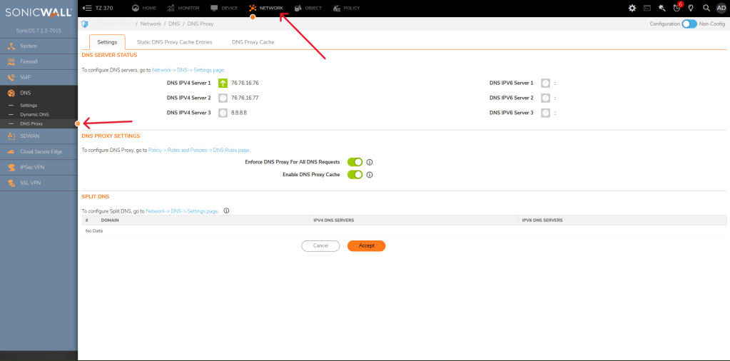 However, the option to ‘Enable DNS Proxy’ is no longer an option on either of these pages in SonicOS 7.1.3-7015. Instead, follow the steps below.