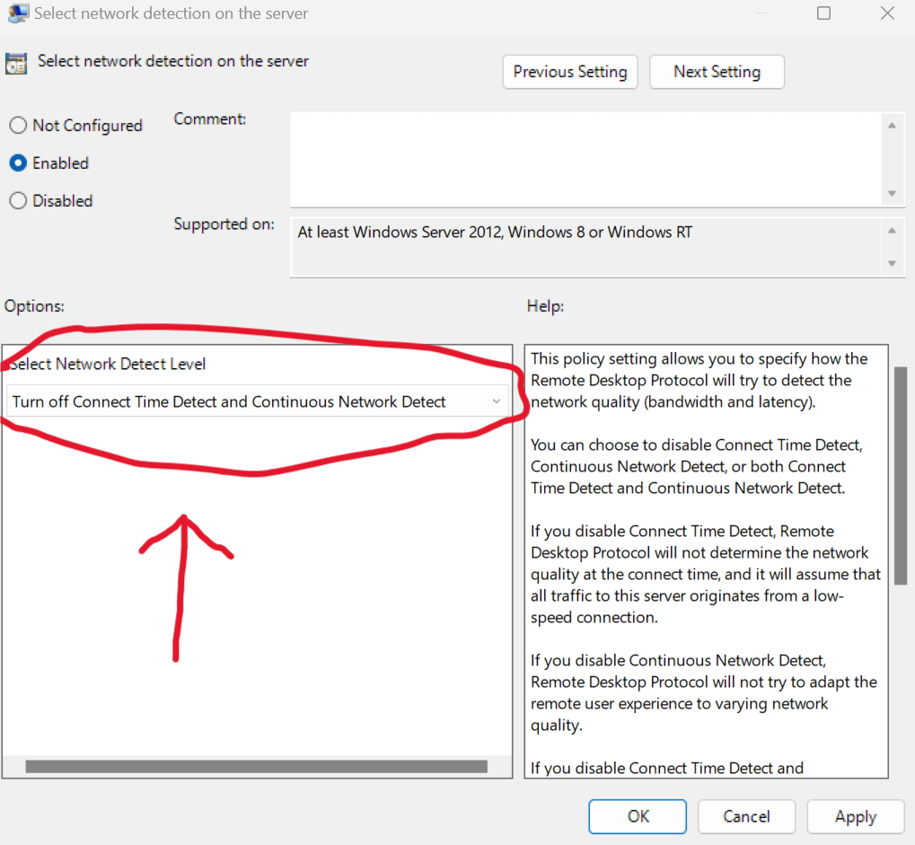 Step 3. Navigate through, Local Computer Policy> Computer Configuration> Administrative Templates> Windows Components> Remote Desktop Services> Remote Desktop Session Host> Connections> and choose ‘Select network detection on the server‘ to ‘enabled’ and select ‘Turn off Connect Time Detect and Continuous Network Detect.’ See the screenshot below.